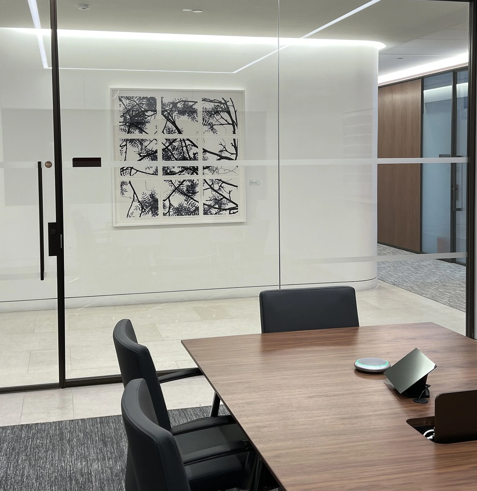 An office interior with a board room table and a photograph hanging in the hallway.